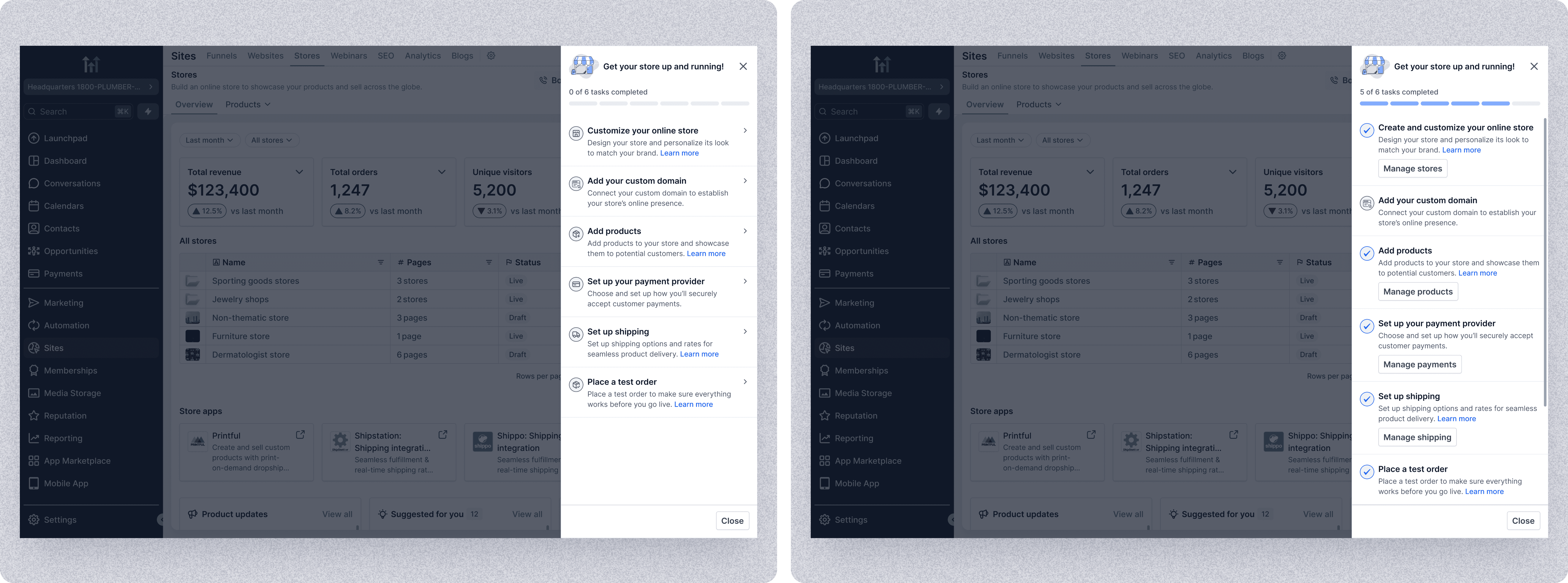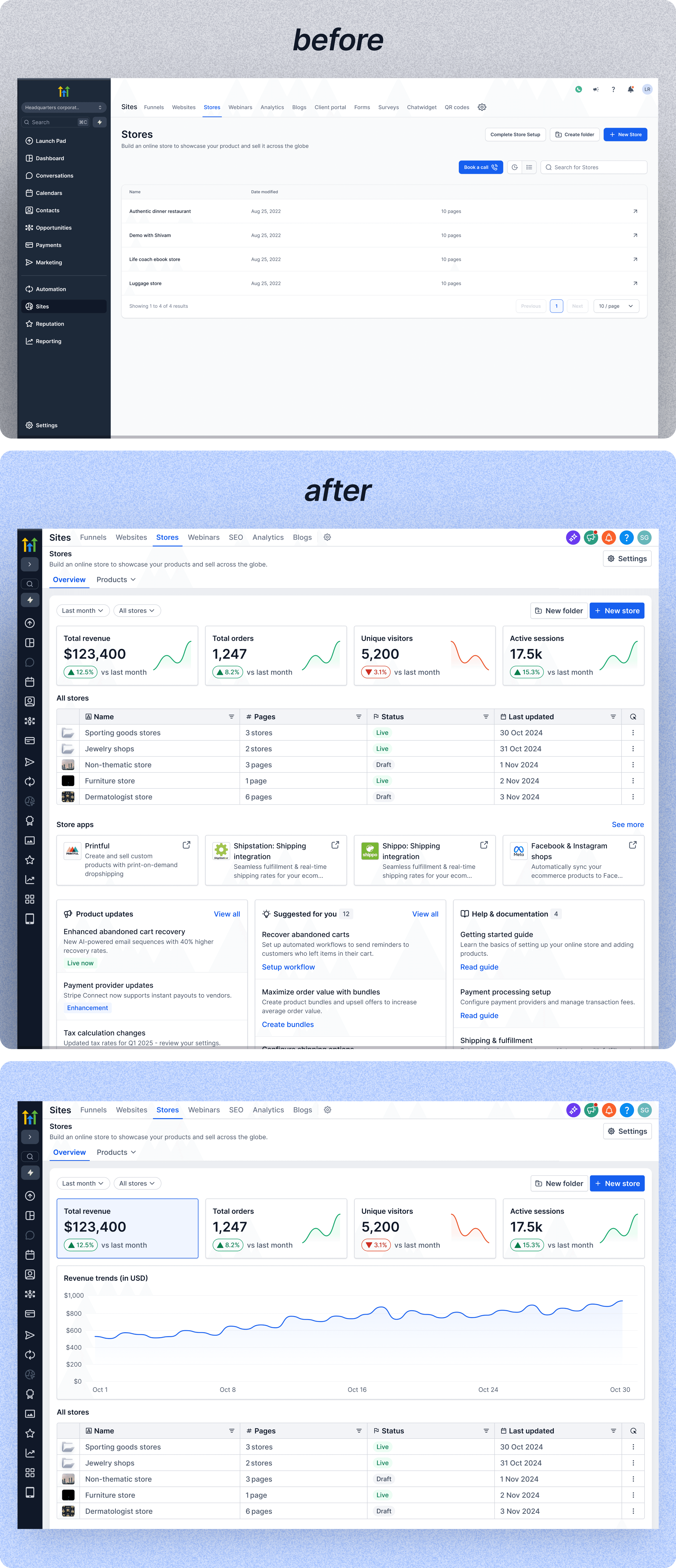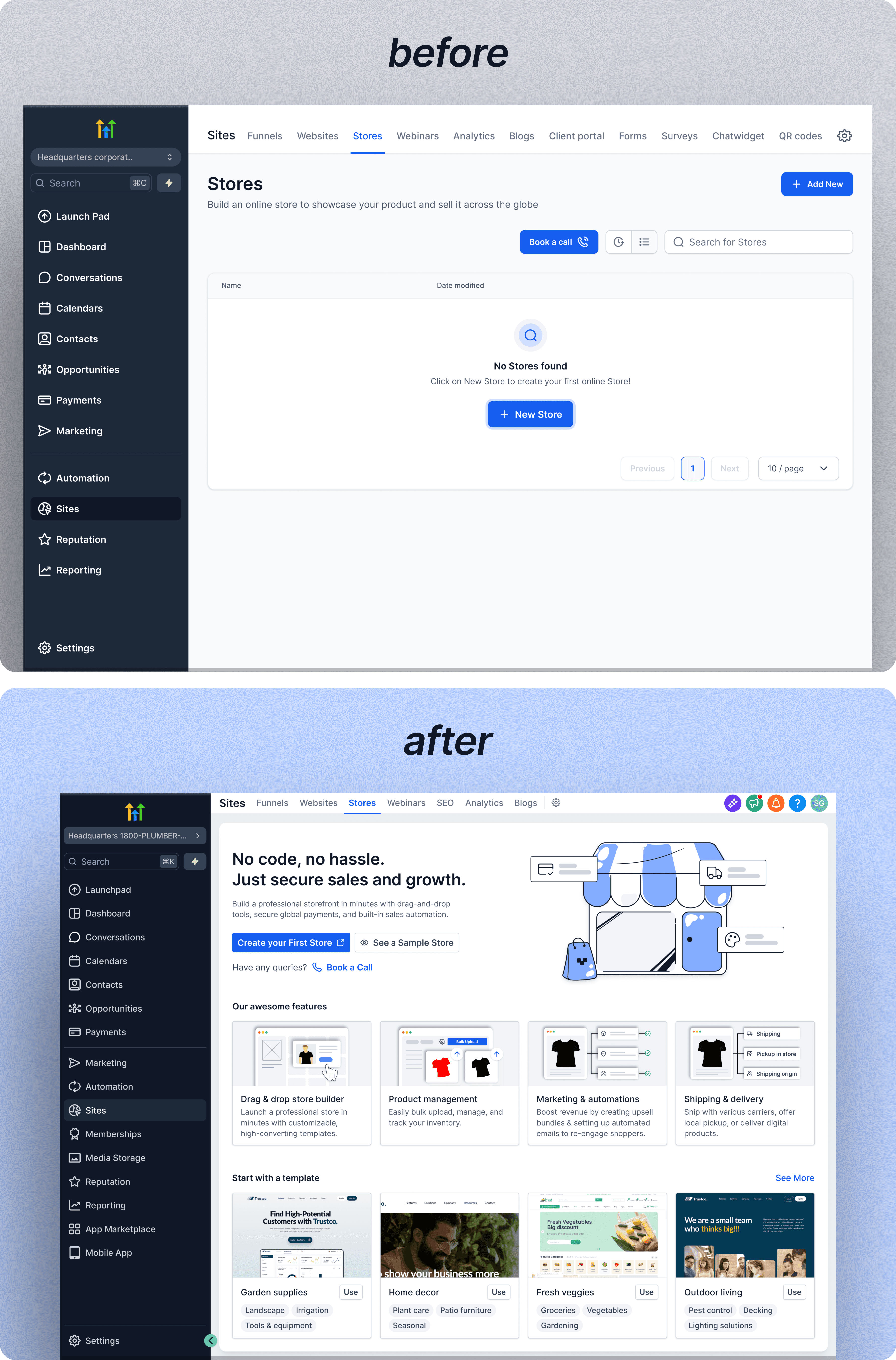 HighLevel’s ecommerce functionality had grown across multiple surfaces - Stores, Products, Payments, Shipping, Notifications, Apps. Each worked independently. Together, they formed a fragmented activation experience.